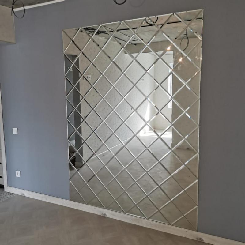 Зеркально панно было сделано из зеркальной плитки 30х30 см, размер панно 255х255 см