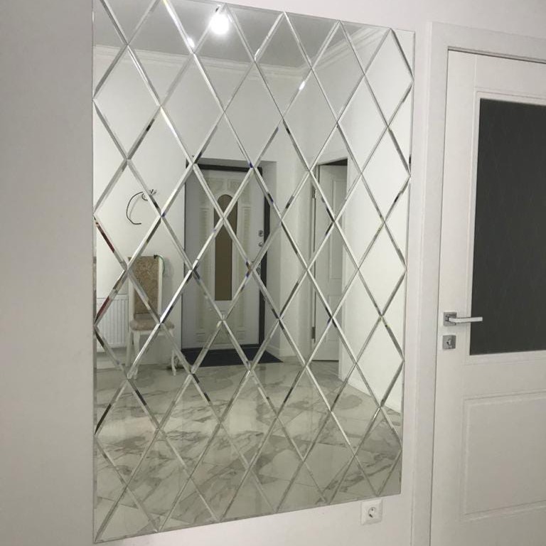 Использована квадратная серебристая зеркальная плитка размером 18х18.